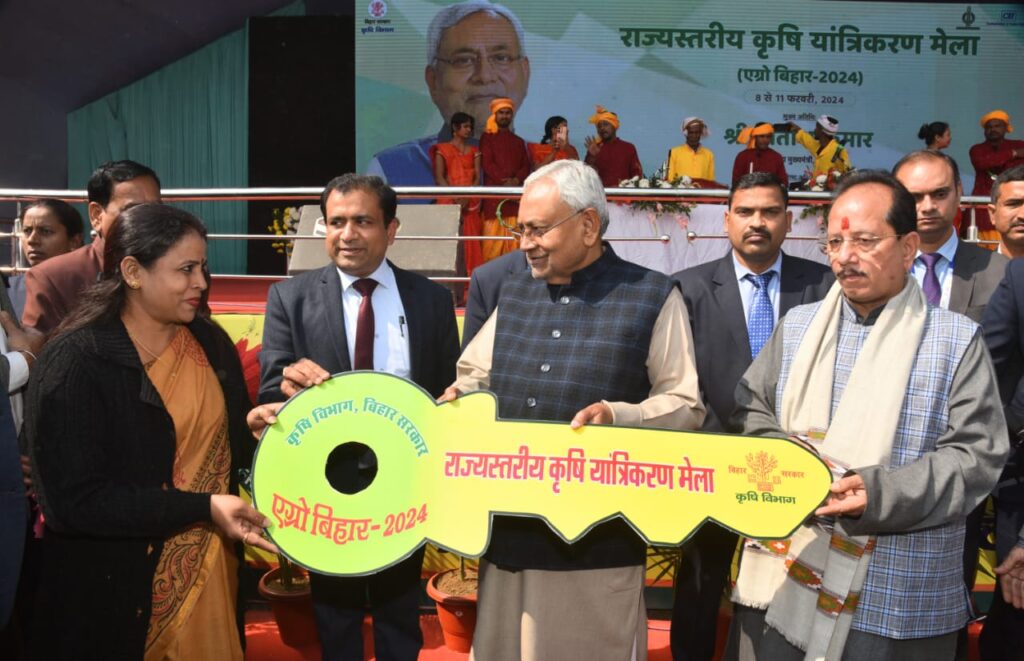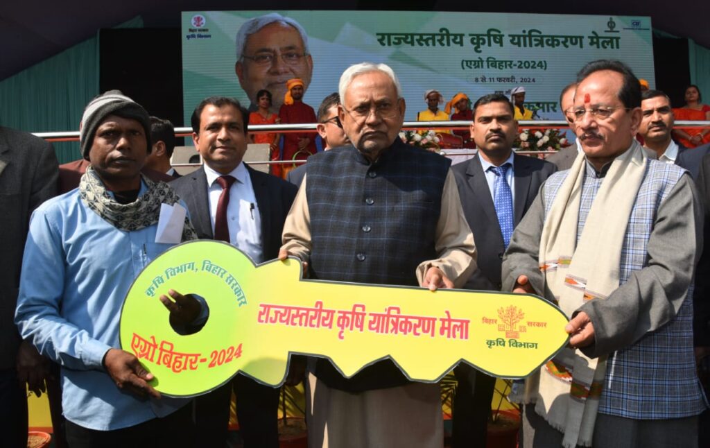 पटना :- मुख्यमंत्री नीतीश कुमार ने गांधी मैदान में आयोजित राज्यस्तरीय कृषि यांत्रिकरण मेला (एग्रो बिहार-2024) का भ्रमण किया। भ्रमण के दौरान मुख्यमंत्री ने विभिन्न स्टॉलों पर जाकर कृषि के लिये उपयोगी आधुनिकतम कृषि यंत्रों के बारे में जानकारी ली। इस राज्यस्तरीय कृषि यांत्रिकरण मेला में देश के प्रमुख कृषि यंत्र निर्माताओं द्वारा आधुनिक यंत्रों का प्रदर्शन किया गया है। भ्रमण के दौरान मुख्यमंत्री ने सरकारी अनुदान प्राप्त कृषि यंत्रों के क्रय करनेवाले प्रगतिशील किसान लाभार्थियों से मुलाकात की तथा उनसे कृषि यंत्रों के उपयोग के संबंध में बातचीत की और उन्हें प्रोत्साहित किया।
